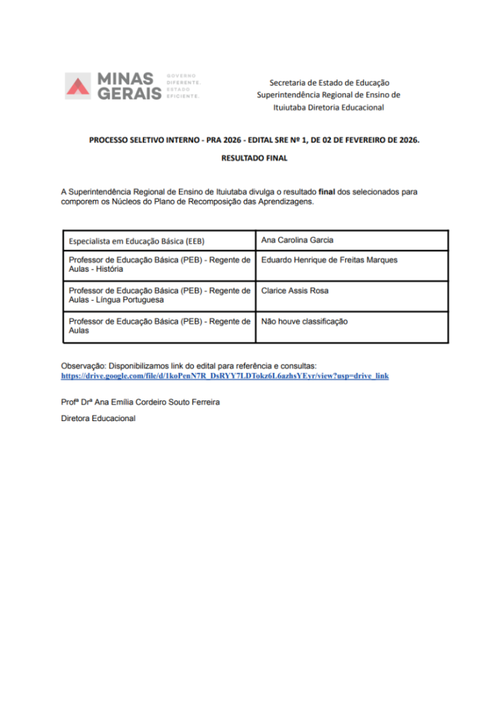 RESULTADO FINAL PROCESSO SELETIVO INTERNO – PRA 2026 – EDITAL SRE Nº 1, DE 02 DE FEVEREIRO DE 2026 -RESULTADO FINAL
