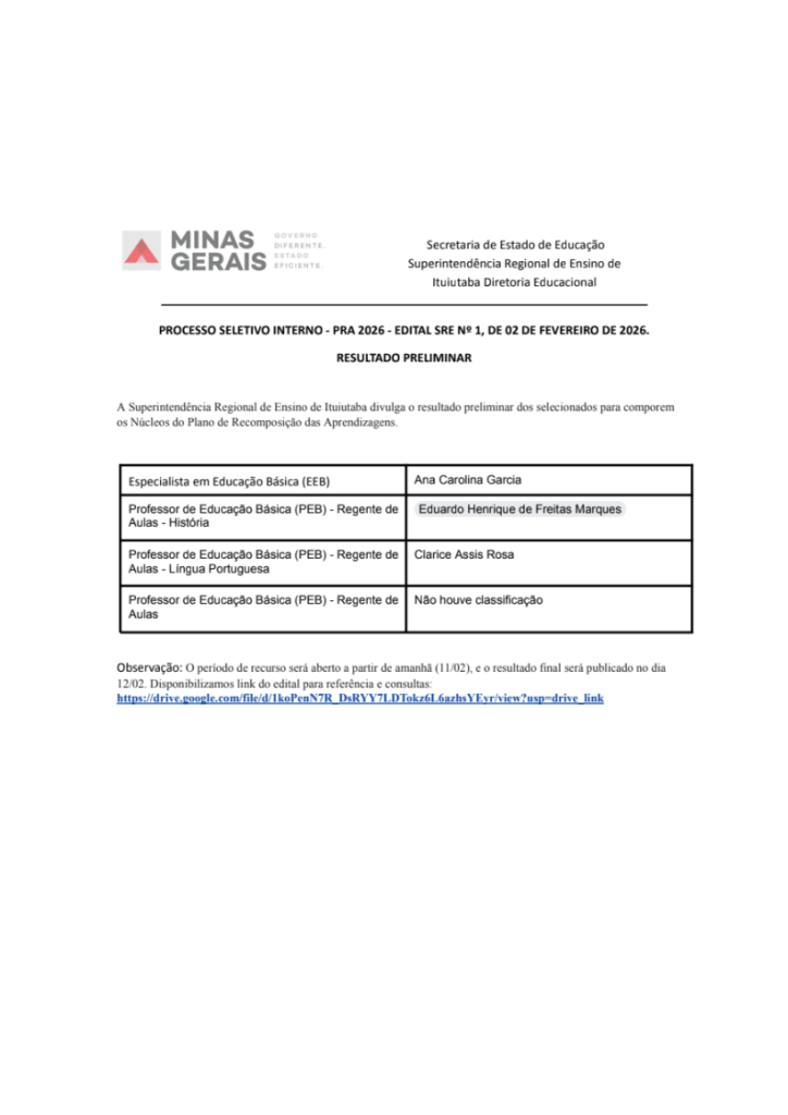 Resultado Preliminar Processo Seletivo Interno – PRA 2026 – Edital SRE nº 1, de 02 de fevereiro de 2026